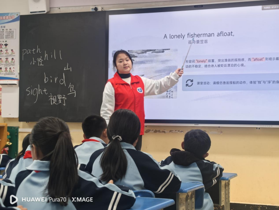 在本期活动中,首先开展的是英文歌曲教学聚焦《Happy New Year》,通过词汇拆分、分句领唱、律动互动等方式,帮助学生快速掌握歌词与发音,在欢快氛围中提升英语语感。其次,英文古诗《江雪》为教学内容,先讲解中文意境,再引入英译版本,通过对比分析、朗读接龙等形式,让学生感受中英语言韵律之美。最后,是英文话剧排演改编经典故事《三打白骨精》,简化剧情与台词,组织学生分角色排练,开展一对一指导与内部展演,提升学生口语表达与团队协作能力。