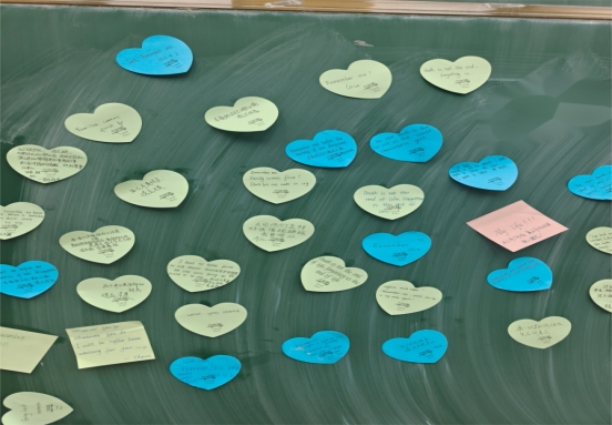 观影结束后,同学们在便利贴上写下对逝去亲人的思念以及自己喜欢的电影台词。一张张便利贴贴满了展板,“记得我,我就一直在”“家人是比梦想更重要的事”“外婆,我想你了”等话语,传递着同学们内心深处最真挚的情感。