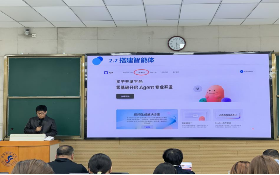 讲座后半段聚焦实操,王老师演示了在扣子平台搭建专业翻译智能体的流程,详解知识库、记忆库与工作流设计的关键要点,以及如何创建属于自己独特的数据库,并结合教学、翻译竞赛案例,探讨了智能体在课程建设、教材开发、产学研协同中的价值转化路径。讲座尾声,王老师与在场师生就翻译技术的应用前景等话题进行了互动交流。