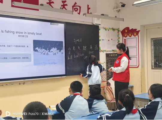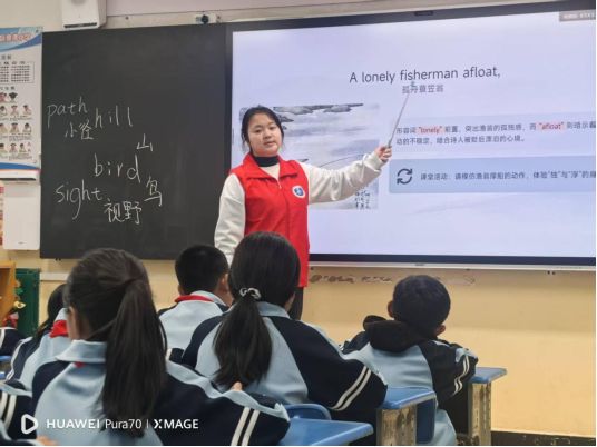 作为志愿团队的一员,这次教小学生英语版《江雪》的经历,彻底改变了我对“英语教学”的认知。出发前我反复打磨英语台词,生怕学生听不懂,却忽略了古诗最核心的“意境”。直到有个孩子指着窗外的落叶说:“老师,这就像诗里的雪,轻轻的。”我才突然醒悟,语言只是载体,让孩子感受到“美”才是关键。