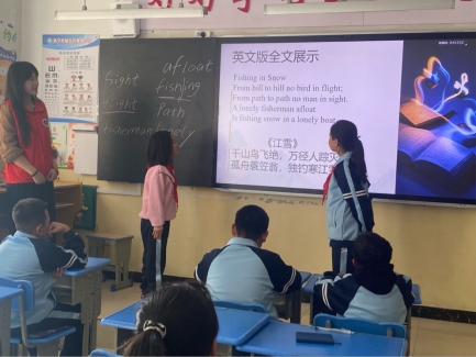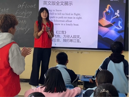 20251017日,外国语学院本科生党支部志愿者前往西宁市城北区泉湾小学,开展“语泉相助,荧光相行”诗歌教学志愿服务活动。活动以英文版《江雪》为教学内容,通过诵读、释义、背诵与创意演绎相结合的方式,引导学生感受英语语言之美,体验诗歌意境,提升语感与记忆能力,实现英语学习与传统文化感知的双向融合。