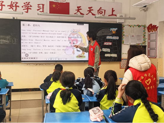 本次活动中,志愿者带领10名小学三至六年级学生开展1小时的英语课本剧《三打白骨精》志愿活动,完成生词教学与剧情解析。现场表演显示,核心生词认读正确率有明显提升,大部分学生能脱稿演绎关键台词,部分完成带动作表情的完整剧情表演。